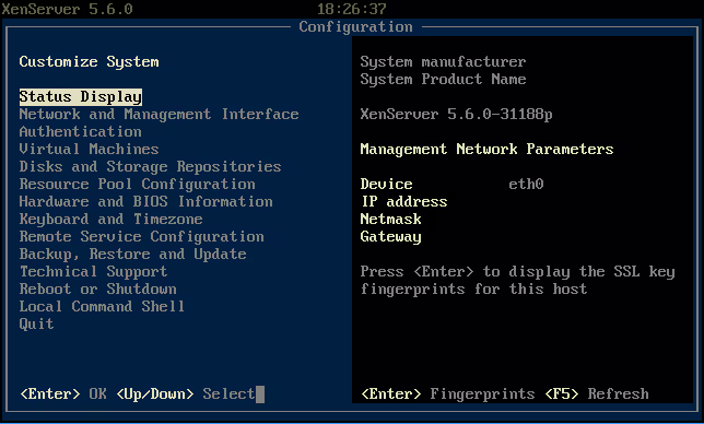 Remplacez le bleu par du jaune, et le noir par du gris… Ça ne vous rappelle rien? Et oui, vous aurez bien sûr reconnu l’interface de configuration de VMware ESXi… Enfin bon, du coup ce n’est pas dur de s’y retrouver. D’autant plus qu’il n’y a pas vraiment de différences d’utilisation entre cette console et celle de ESXi (un peu plus fournie pour XenServer), car elle ne vous servira qu’à configurer le strict minimum, puisque le gros de l’utilisation se fera depuis le XenCenter.