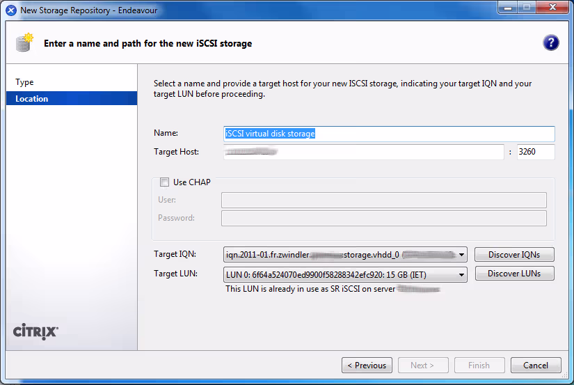 J’ai donc commencé par mettre en place sur mon NAS perso une target iSCSI, que j’ai configuré sur mon XenServer. Bonne nouvelle, c’est TRES simple à mettre en place. XenCenter propose une interface qui permet de rechercher les targets disponibles sur votre stockage en quelques clics.