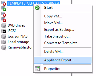 Voilà, on a maintenant le parfait candidat pour un template! Pour pouvoir le créer, on doit éteindre la VM. Pour créer ce template, on a plusieurs possibilités. D’abord, on peut créer une Appliance, qui est en fait un template destiné à être exporté sur le web dans un format standardisé (.ovf). Typiquement, ce mécanisme est utilisée par des personnes qui fournissent une VM fournissant un service préinstallé, ou, dans le cas de la virtualisation VMware, par les utilisateurs de ESXi sans vCenter pour contourner l’absence de cette fonctionnalité :-p (je ferai un article là dessus bientôt).