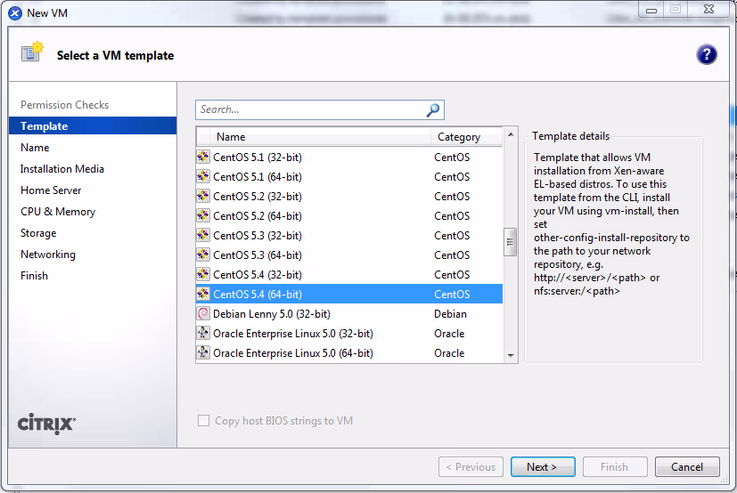 La première chose à faire pour créer un template c’est de commencer par créer la VM qui nous servira de modèle. Ceux qui auront toujours la même version 5.6 de XenServer que moi s’apercevront qu’il n’y a pas de template prédéfini pour CentOS 5.5. Nous prenons donc un 5.4, ça ne pose pas de problèmes dans le cas d’une installation par le Net (ce que je présenterai ici). Dans le cas d’une installation par l’iso, je crois que c’est plus problématique, et qu’il n’y a pas vraiment de solution à par installer via un DVD 5.4 puis changer de version par la suite (à vérifier).