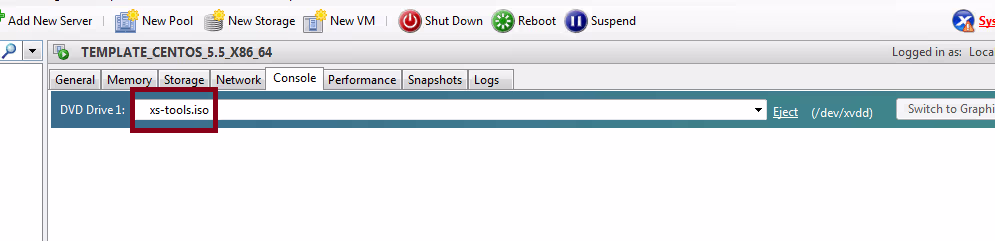 Si tout se passe bien, il fini par rebooter au bout d’un moment. La première chose à faire une fois que la VM est fonctionnelle, c’est d’installer les XenServer-Tools. En effet, ce sont eux qui permettent à la VM d’être complètement « consciente » de son état de VM et donc d’atteindre l’ataraxie la paravirtualisation (gain de performance et gain en contrôle sur la VM). Par défaut, ces XenServer Tools sont situées dans un iso que l’on monte donc sur la VM.