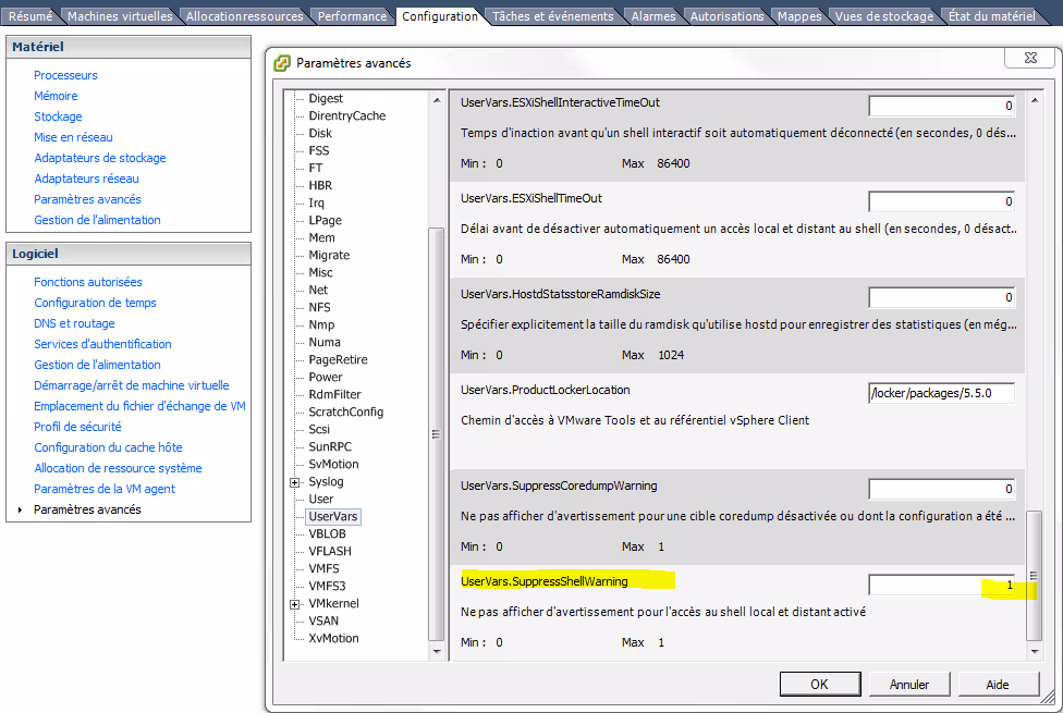 Vous l’avez peut être remarqué, depuis la version 5 de VMware, lorsque vous activez le SSH ou le Shell ESXi (anciennement réservé à la maintenance sur la version 3.5/4.0, voir </2010/04/28/esxi-4-0-explorons-lhidden-console-part-1/>) le client desktop ainsi que le client Web vous informe d’une erreur dans votre configuration.