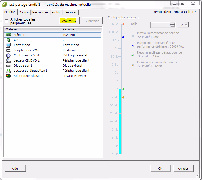 Ouvrir les paramètres de la machine virtuelle test_partage_vmdk_1, et ajouter un nouveau périphérique (Disque dur).