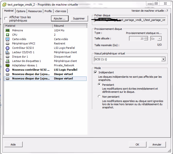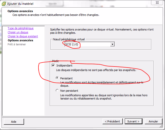De la même manière que précédemment, on doit créer un disque dur virtuel sur un nouveau contrôleur SCSI et en mode Indépendant-Persistant.
