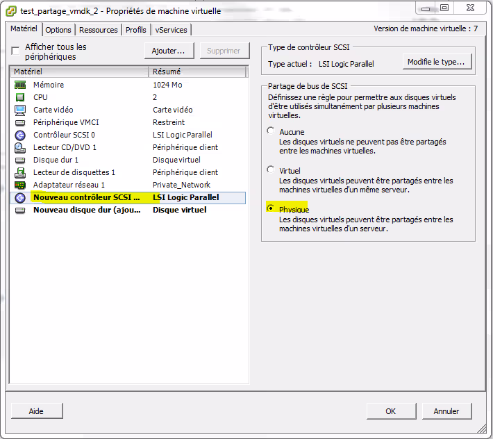Une fois le disque créé, un nouveau contrôleur SCSI est également créé. Avant de valider la création du disque et du contrôleur SCSI, il faut modifier le paramètre de Partage de bus de SCSI en mode « Physique ».