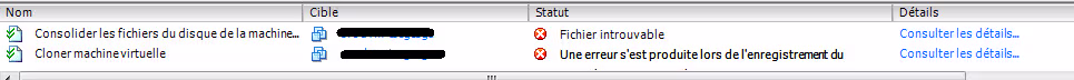 Lors d’un clone de machine virtuelle à chaud, le serveur vCenter déclenche un snapshot temporaire pour pouvoir disposer d’un état au repos du disque dur à cloner. Et c’est pendant cette étape que j’ai reçu une erreur qui a non seulement fait planter mon clone, mais m’a aussi bloqué ma machine virtuelle.