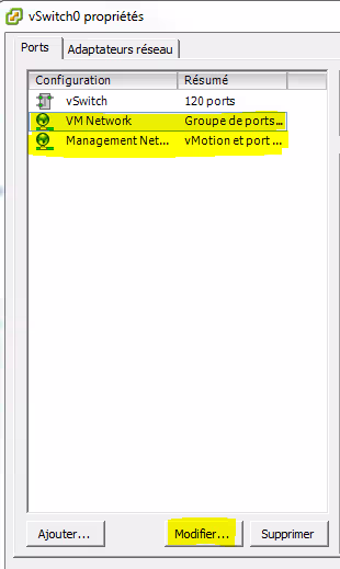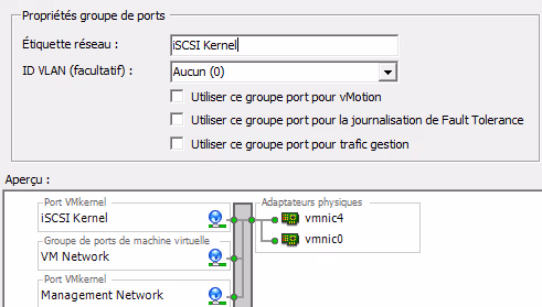 Reproduire la manipulation pour tous les VMKernel (VMNetwork et Management Network dans l’exemple, mais pas le vSwitch, qui doit lui avoir toutes les interfaces).