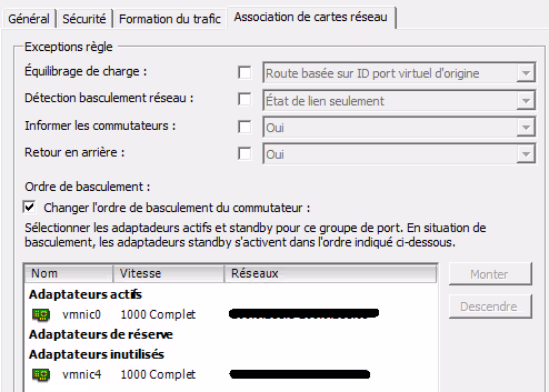 Dans l’onglet Association de cartes réseau, cocher Changer l’ordre de basculement du commutateur, puis déplacer la vmnic4 dans les Adaptateur inutilisés.