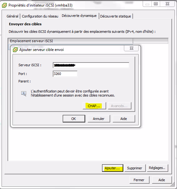 Renseigner l’adresse IP de la cible iSCSI à ajouter, puis cliquer sur CHAP pour renseigner les informations d’authentification (décocher Hériter du parent pour modifier).