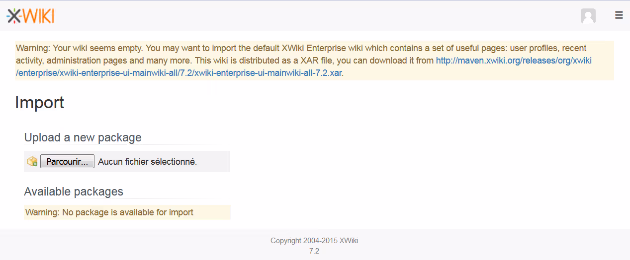 Attention : Ce qu’il faut savoir c’est que par défaut, les XWiki sont installés sans aucunes pages. Les pages par défaut doivent être chargées manuellement via un import la première fois. C’est à ça que sert le fichier xwiki-enterprise-ui-mainwiki-all-7.2.xar que vous avez téléchargé au début de la procédure.
