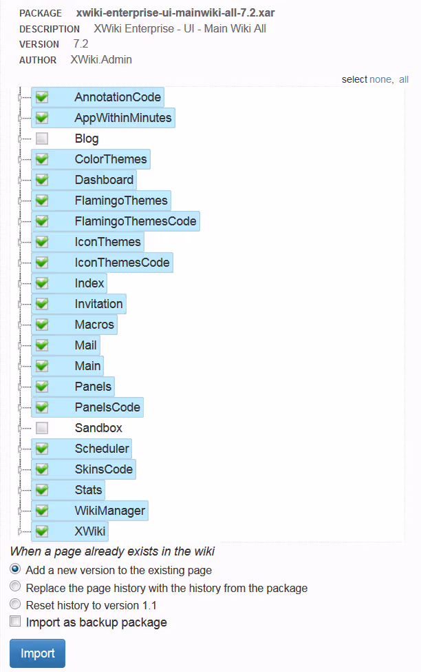 En cliquant sur le fichier xar qui vient d’être uploadé, on peut sélectionner les pages qu’on ne souhaite pas utiliser (typiquement j’ai désactivé Blog et Sandbox qui ne me servent pas).