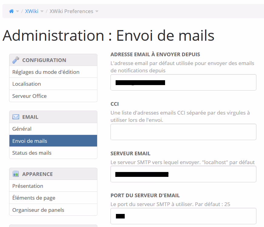 Si vous souhaitez utiliser la notification par email, la première chose est bien entendu de configurer votre serveur pour l’envoi d’email ou de renseigner dans l’application un serveur SMTP qui pourra faire le relais. Tout se gère dans le menu d’administration du XWiki.
