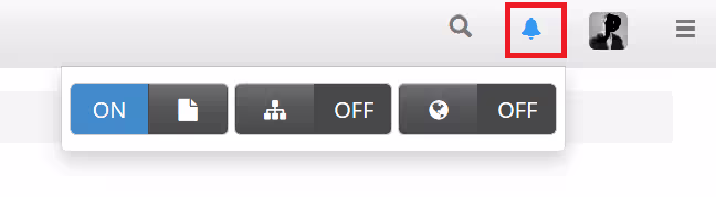 Une fois la page favorite sélectionnée, on clique sur le bouton en forme de cloche, puis on sélectionne si on souhaite ne s’abonner qu’à cette page (premier bouton), à cette page et ses fils (second bouton) ou à tout le wiki dans sa globalité.