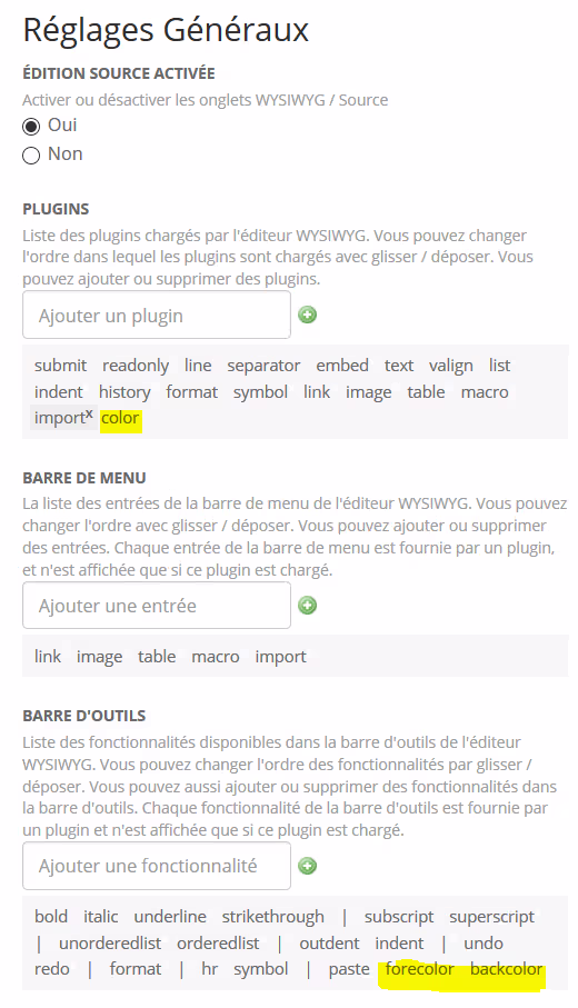 Par défaut, l’éditeur visuel (WYSIWYG) n’active pas le module de couleur (couleur du texte et surlignage). Pour autant, il peut facilement être ajouté car il s’agit d’un module intégré par défaut mais désactivé.