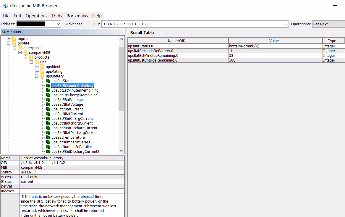 Pour trouver cette MIB (.1.3.6.1.4.1.21111.1.1, originalement nommée UPS), j’ai tout simplement utiliser un snmpwalk sous Unix en me connectant à l’adresse IP de l’onduleur après configuration. Sous Windows, on peut aussi utiliser un utilitaire graphique pour faire la même chose, notamment avec iReasoning MIB Browser qui nous donne également quelques informations sur les indicateurs disponibles.