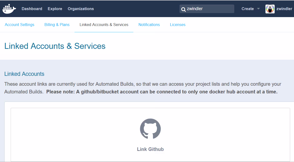 Ce menu vous permet de lier le Dockerhub avec un ou plusieurs comptes Github/Bitbucket via une autorisation de type OAuth.