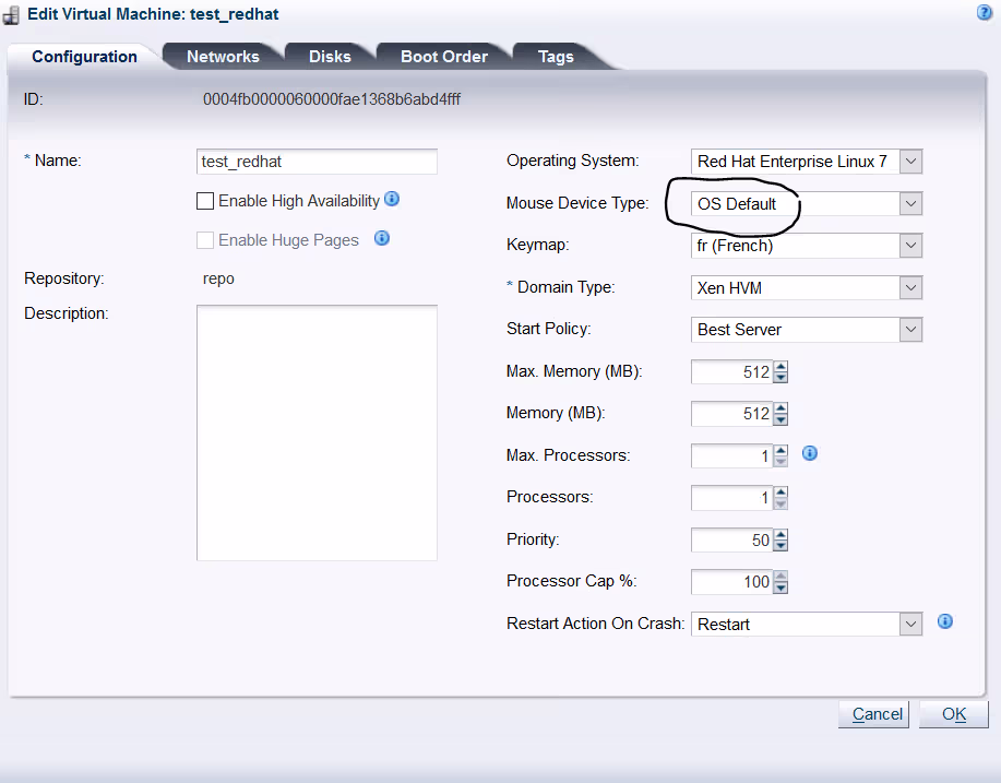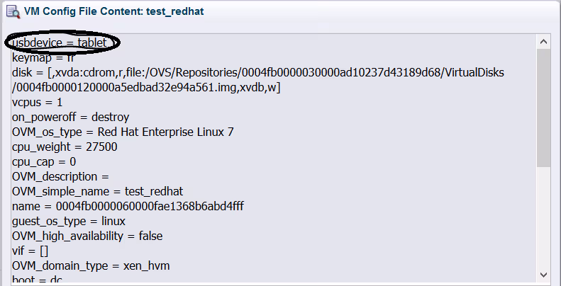 La documentation fait elle état d’un fichier de configuration de la machine virtuelle mais je n’ai pas su trouver ce fichier. Cependant, et ce n’était pas dit dans la documentation on peut modifier ce paramètre directement depuis la GUI de Oracle VM Manager !