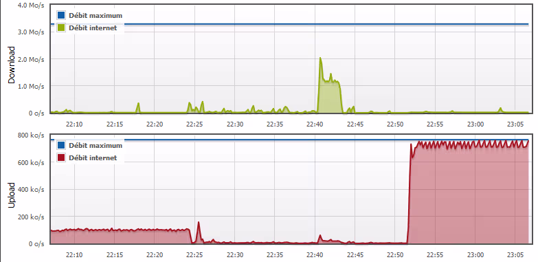 Dans la capture suivante, vous pouvez admirer ma connexion ADSL saturée en upload par la copie d’un fichier d’une machine virtuelle depuis mon serveur dans mon dressing vers mon kimsufi. Et après vérification, on a bien le fichier de machine virtuelle des deux côtés :-).
