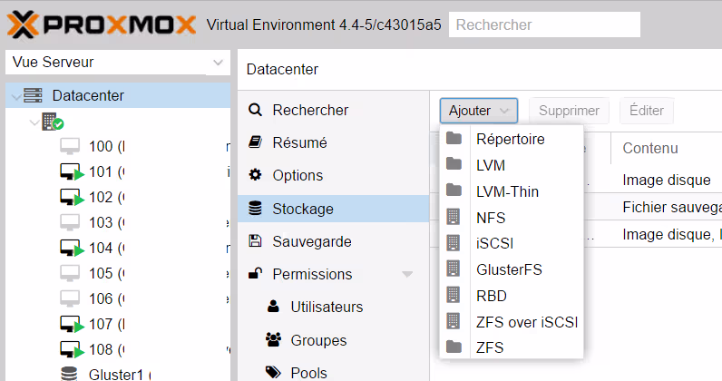 Depuis la console Proxmox, dans le menu « Stockage », cliquer sur « Ajouter / GlusterFS »
