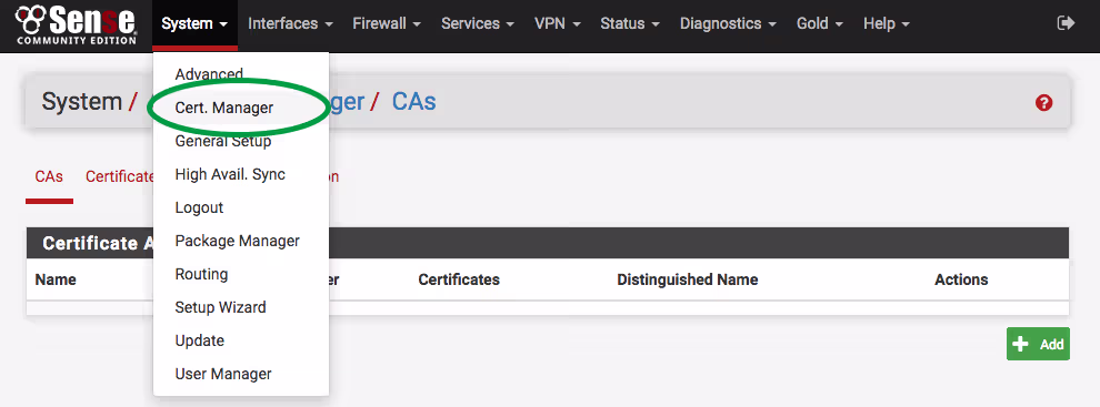- Naviguer jusqu’à la liste des « CAs » via le menu System > Cert Manager :