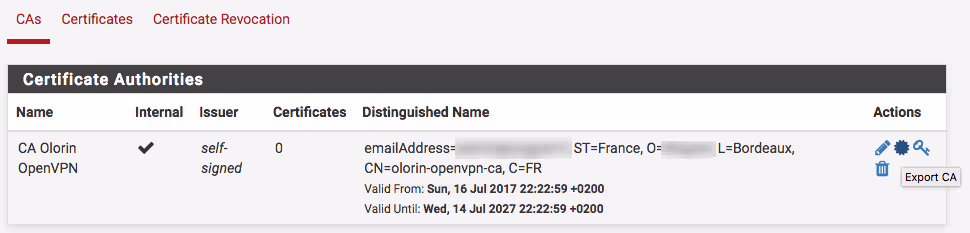 Certificate authority : Sélectionner la CA créée juste avant (toujours la seule normalement)
