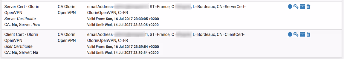 Il ne vous reste plus qu’à sauvegarder la modification. L’idée est de créer un couple user/certificat client par personne (logique) voir par machine cliente, ça permet notamment pouvoir les révoquer individuellement au besoin. Enfin si vous avez besoin de plusieurs utilisateurs, créez leur un groupe dédié pour les ranger (c’est plus propre, on est pas des sauvages).