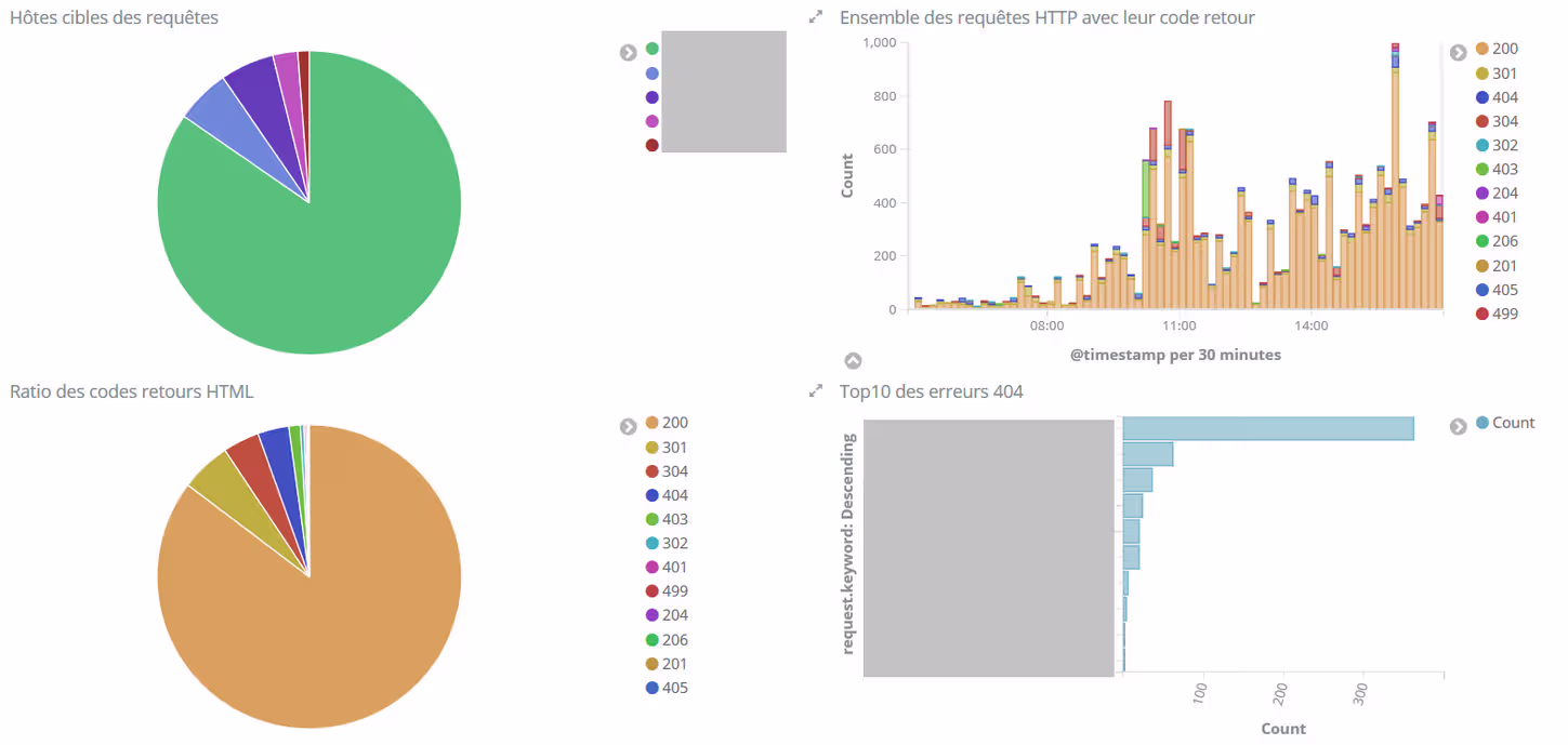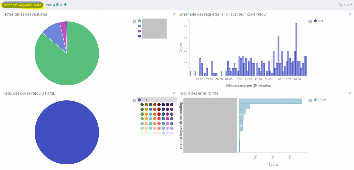 Par exemple, si je veux obtenir plus de détails sur les code retours 404, il me suffit de cliquer sur le code 404 dans le camembert, et Kibana filtrera les données de TOUS les graphiques du dashboard pour ne m’afficher que les données correspondantes :