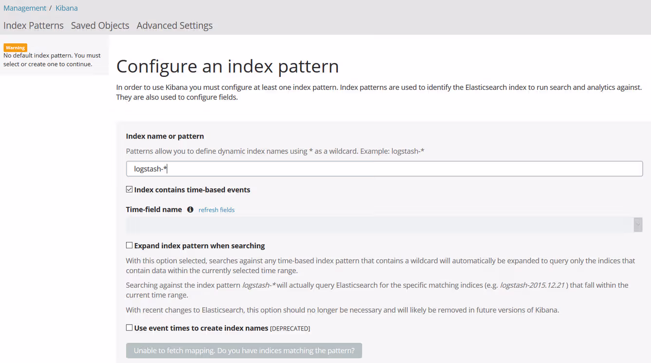 C’est bien gentil tout ça, mais pour l’instant on a rien du tout… Au delà de la simple connexion à Kibana, vous arriverez sur un écran de configuration qui cherchera, sans succès, des données dans elasticsearch.
