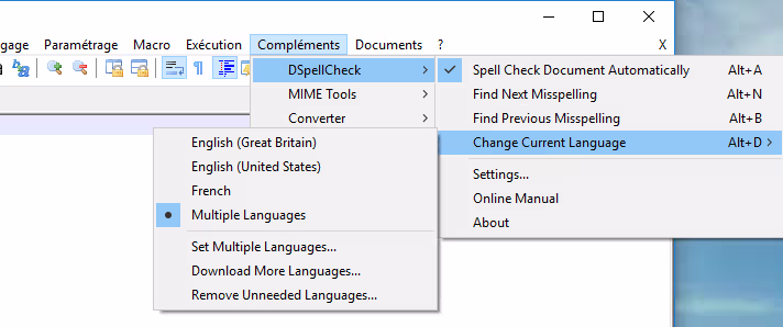 - Aller dans le menu Compléments/DSpellCheck/Change current language ;