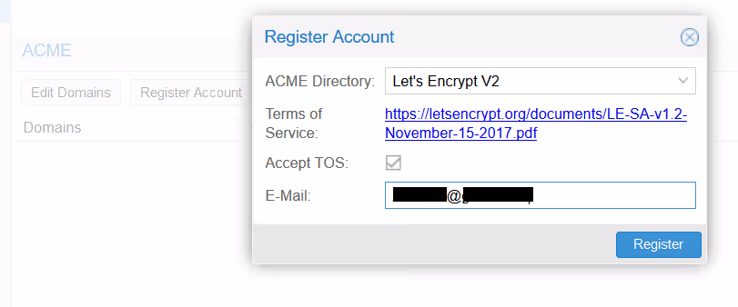 Une fois validé, on peut enregistrer un compte. Il s’agit de l’email qui sera renseigné chez Let’s Encrypt pour qu’ils vous préviennent de l’expiration proche du certificat si jamais par malheur le mécanisme de renouvellement venait à ne pas fonctionner.