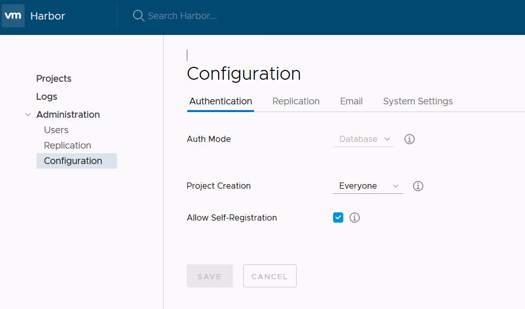 Le sous-menu Configuration permet de visualiser et modifier une partie des paramètres généraux de la plateforme. Une partie des ces paramètres proviennent de la configuration harbor.cfg renseignée lors de l’instanciation (via Ansible dans notre cas). Certains ne peuvent pas être changés depuis l’interface (comme la méthode d’authentification par exemple, mais je ne le testerai pas si j’étais vous…).