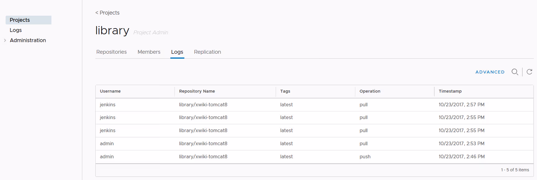 La vue Logs permet aux administrateurs d’avoir une vue d’ensemble des logs (pull, push, etc) de TOUS les projets de manière centralisée.