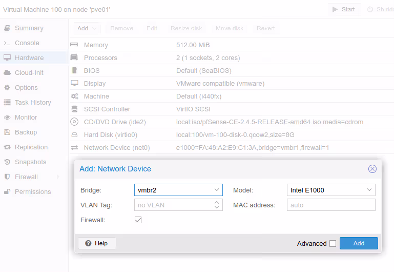 Cliquez sur la VM, puis Hardware, et « Add/Network Device ». Choisissez vmbr2 et le même modèle que vous aviez choisi pour vmbr1.