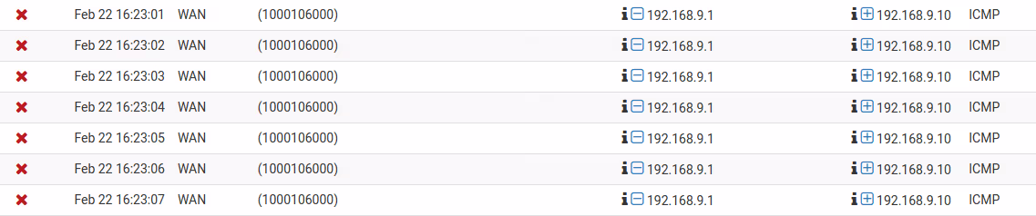 Cette vue est utile car elle vus permet de voir tout ce qui a été récemment bloqué. Les petits (-) et les petits (+) vont vous permettre d’ajouter rapidement des règles, respectivement pour dropper ou autoriser des connexions similaires que PFSense rencontrerait à l’avenir.
