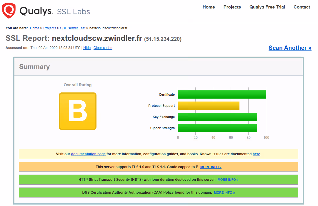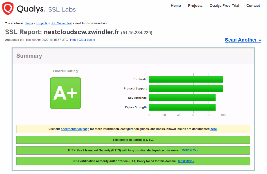 Nextcloud met à disposition un scan de sécurité (scan.nextcloud.com) qui vous permettra de vous tester contre un certain nombre d’attaques connues.