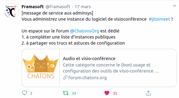 Suite à quoi, les CHATONS se sont proposés de faire le relais en listant un ensemble de services Jitsi et Etherpad mis à dispositions par des CHATONS et des particuliers (et maintenant plus encore).