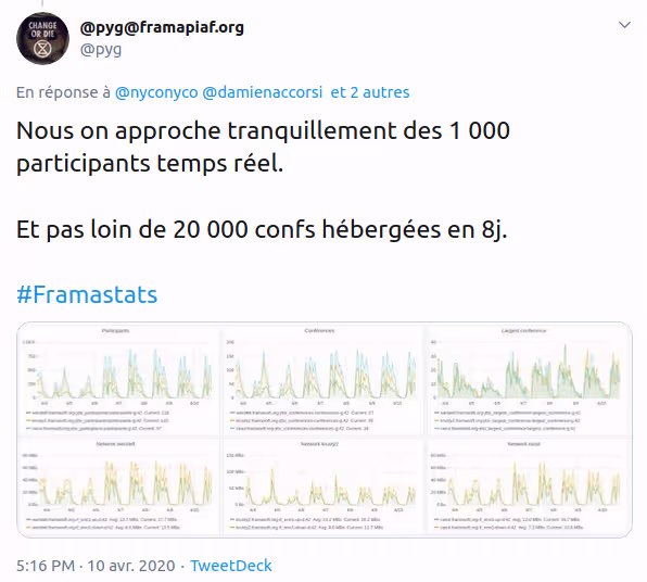 J’ai pas trop communiqué là dessus, mais lorsque le confinement a commencé, les ENT étant down, beaucoup d’enseignants se sont tournés vers Framasoft, qui héberge entre autre des services d’éditions de texte en collaboratif ainsi que des instances de visio conférences Jitsi.