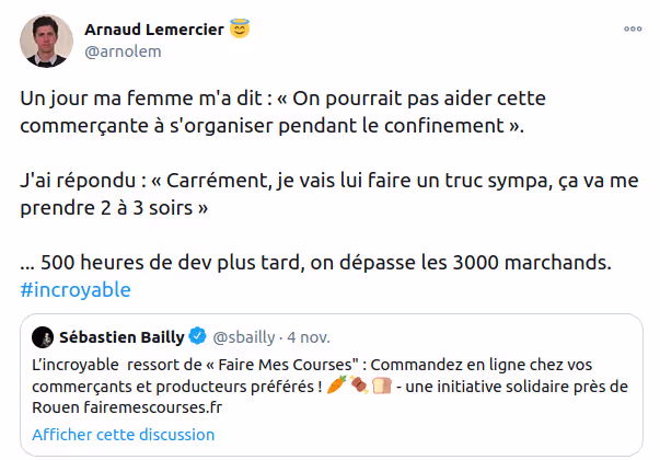 Il y a quelques mois, j’ai découvert l’existence de FaireMesCourses.fr, une plateforme gratuite et solidaire pour mettre en place rapidement des « click and collect » et des commandes en lignes entre commerçants et consommateurs, de manière totalement gratuite. Sauf que même à la sortie du 1er confinement, il n’y avait pas de commerçants dans ma ville (ni même autour)…