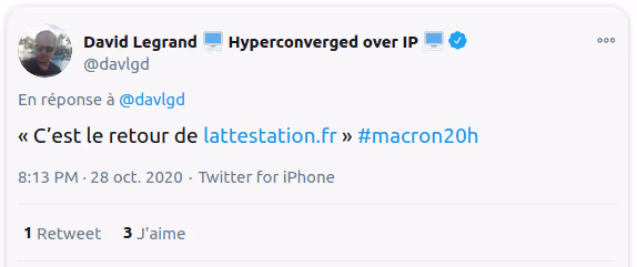 Plutôt que de chercher la vraie URL (ou le bookmark, L.O.L.) pour accéder au site pour générer une attestation PDF, j’ai pris l’habitude d’utiliser la redirection lattestation.fr (lien mort) faite par David Legrand (NextInpact), qui a l’avantage d’être simple à retenir…