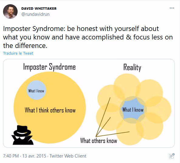 Après quelques mois / années, vous allez vous sentir plus à l’aise avec les tâches quotidiennes. Pour autant, il n’est pas impossible que vous commenciez à ressentir ce qu’on appelle communément « le syndrome de l’imposteur ».
