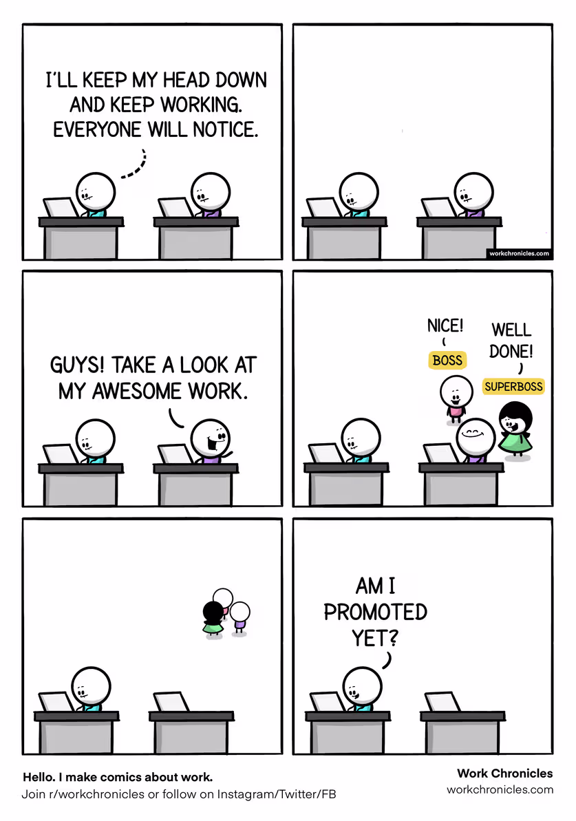 Je travaille dans l’entreprise où je suis actuellement en partie parce que je sais bien montrer ce que je sais faire. Cet effort que je fais pour montrer que j’existe, que je fais des choses (avec passion), m’a apporté (sur un plateau) un meilleur job.