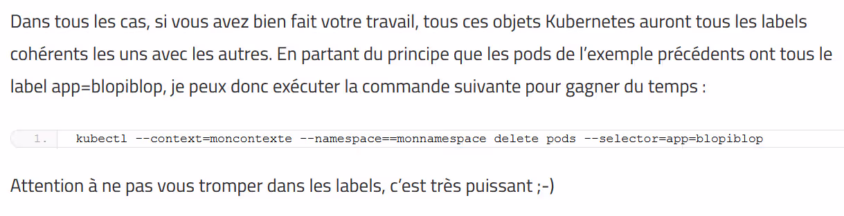 Dans le tout premier kubectl tips and tricks, j’avais parlé de l’option –selector, qui permet de filtrer l’action d’une commande kubectl (get, delete, …) à un couple label+valeur
