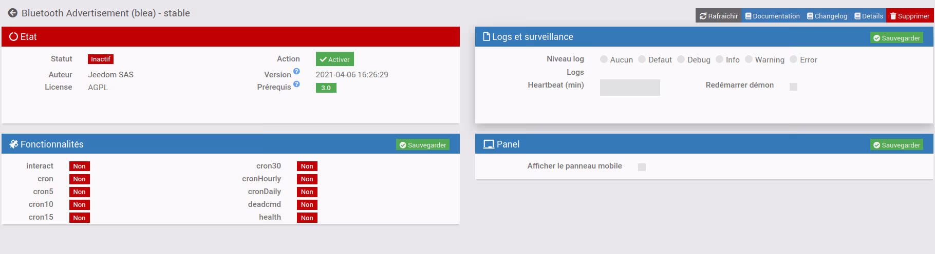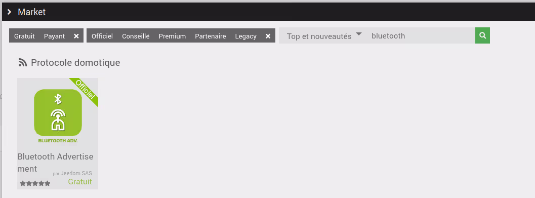 Normalement si vous avez une clé USB bluetooth correctement visible dans l’OS où est installé votre Jeedom, vous avez « juste » à activer le plugin Bluetooth Advertisement disponible sur le Market officiel Jeedom.