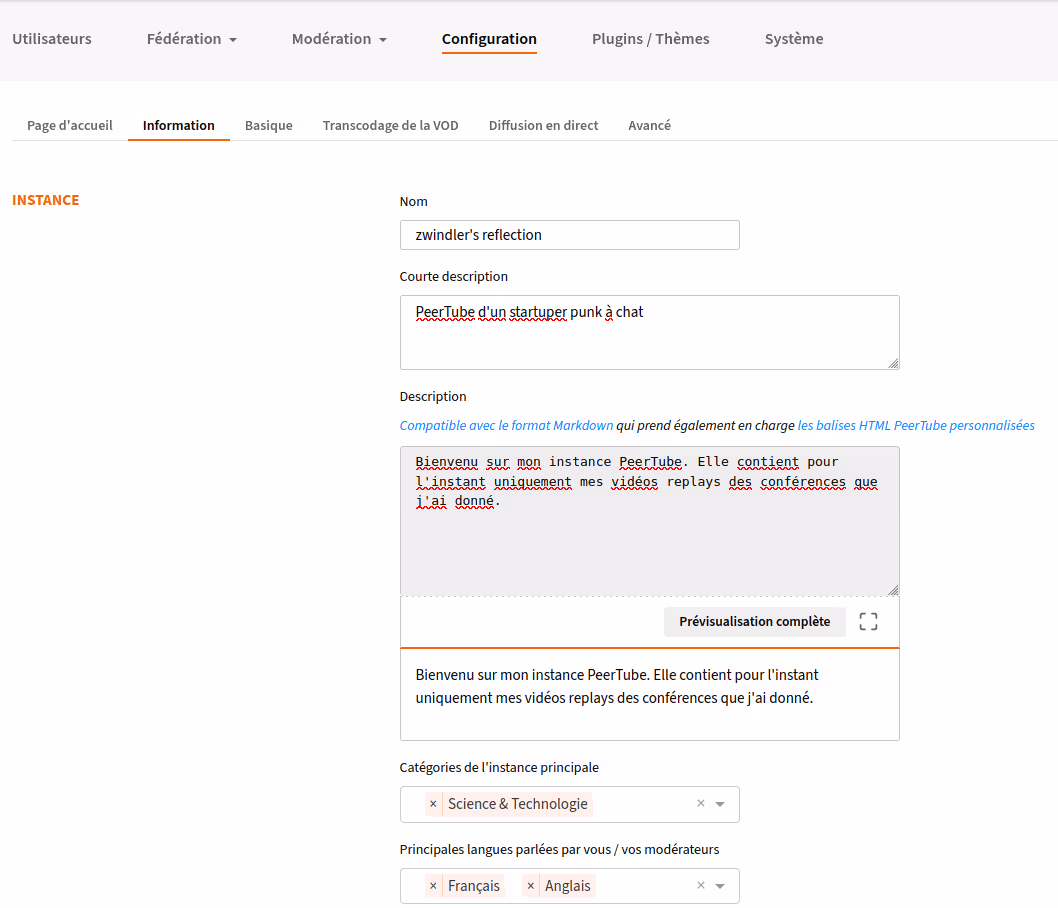 C’est amusant que j’aie décidé de travailler sur PeerTube 3.4 pile cette semaine, car entre le moment où j’ai installé l’instance et le moment où j’ai rédigé l’article, Framasoft a publié un billet de blog pour annoncer la disponibilité de la prochaine majeure (version 4 rc1) de Peertube.