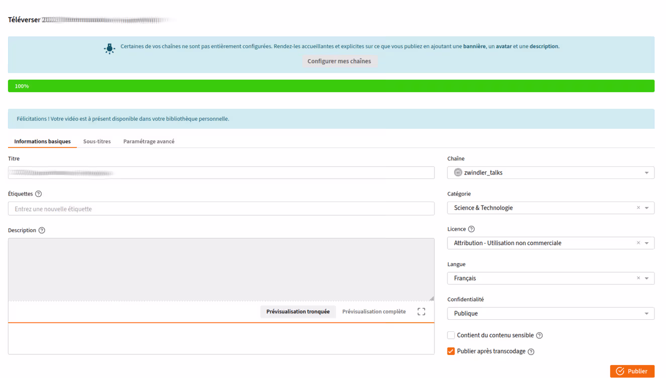Ensuite, une fois la vidéo transcodée, elle devient visible et tout un chacun peu la lire, s’abonner à votre flux, etc.