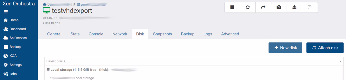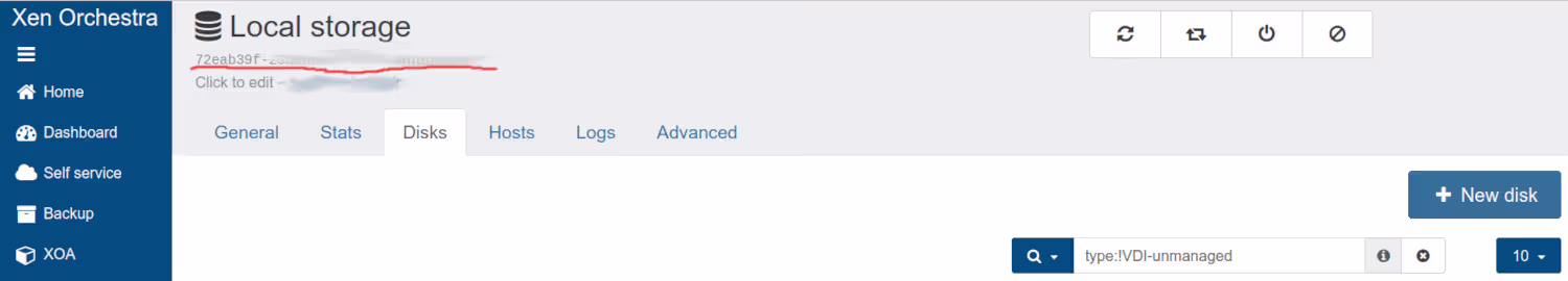 Note: chaque disque et chaque “datastore” a son propre UUID. Ici, j’ai souligné en rouge celui du datastore “Local”, il nous servira plus tard (quand on passe la souris dessus, XOA nous propose de le copier dans le presse-papier).