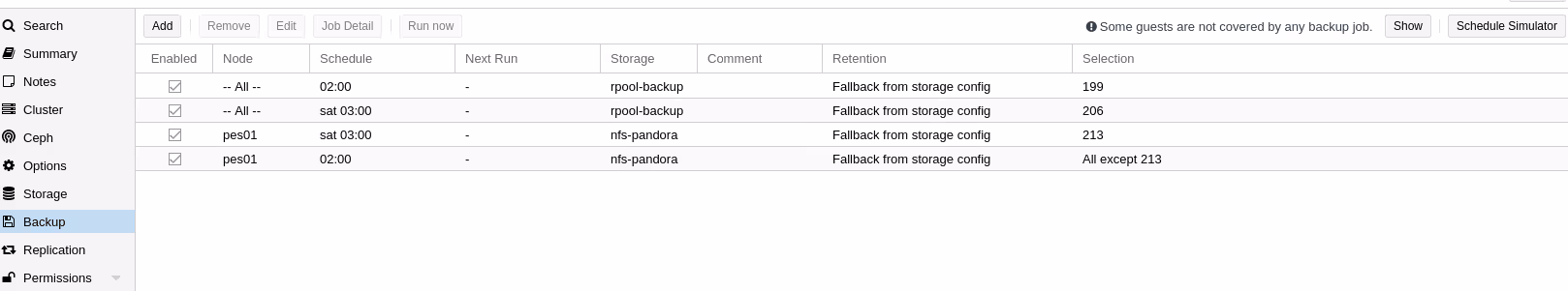Avec mon cluster Proxmox, j’ai aussi un plan de reprise d’activitĂ© (PRA). Les dĂ©veloppeurs de Proxmox VE ont astucieusement tirĂ© parti de la fonctionnalitĂ© de rĂ©plication asynchrone de ZFS pour pĂ©riodiquement (par dĂ©faut toutes les 15 minutes) synchroniser des disques entre des machines distantes.