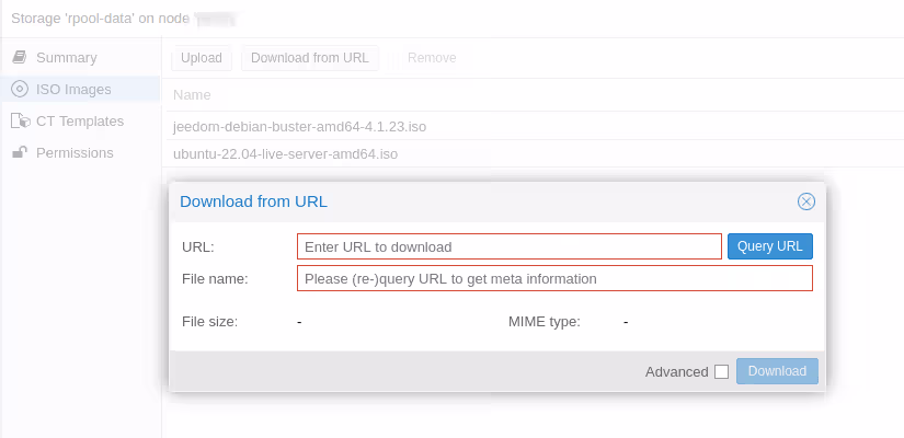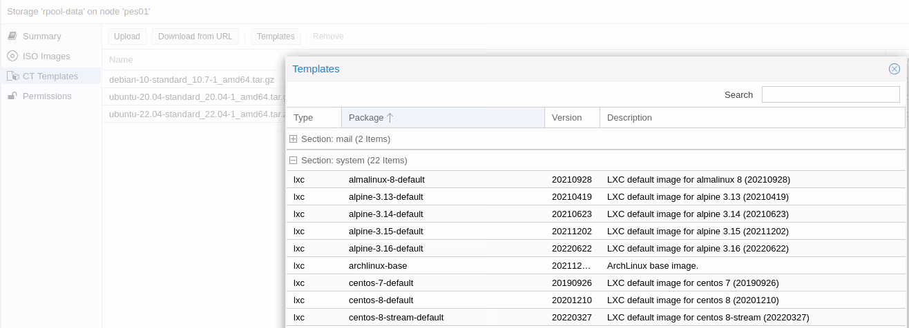 Et de la mĂȘme maniĂšre, vous pouvez aussi tĂ©lĂ©charger les images de containers LXC depuis une URL ou depuis la base d’images dĂ©jĂ accessibles depuis Proxmox VE (la section “systĂšme” me semble ĂȘtre une sous-sĂ©lection des images officielles disponibles sur le site de LXD).