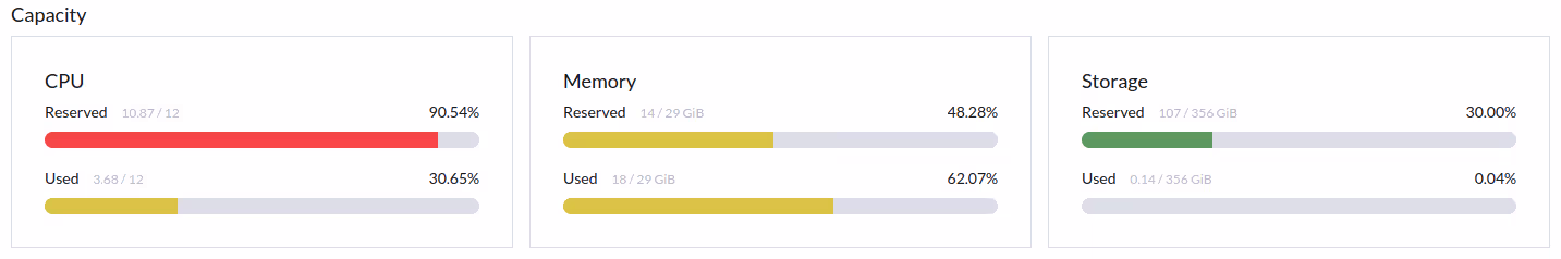 Sans aucune VM, à vide, Harvester réserve déjà quasiment les 4 CPUs de mes 3 machines. Pire, sur la machine harvester01, l’interface me disait réserver plus de cores que ce que la machine disposait (4.5 cores). Niveau RAM, ça allait même si à l’usage 10-12 Go par machine aurait probablement été juste.