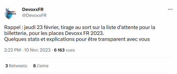 Malheureusement, si vous n’avez pas déjà votre place, ça va être très très chaud. De mémoire il me semble que les 1800 premières places se sont vendues en 9 minutes en fin d’année dernière. Il reste un petit pool de places pour les speakers refusés pour le CFP et pour quelques chanceux/chanceuses.